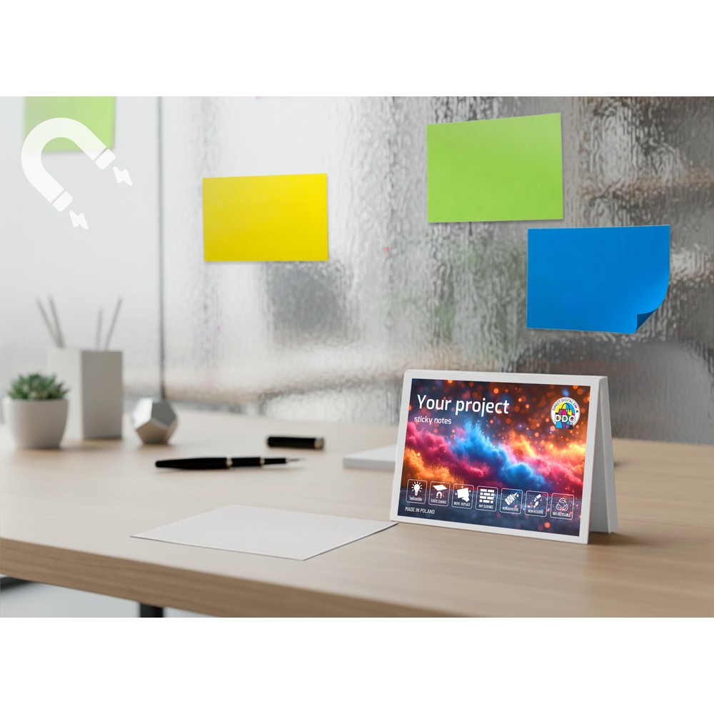 Entdecken Sie die elektrostatischen Haftnotizen – das ideale Werbemittel, das Ihrer Marke mehr Sichtbarkeit verleiht. Mit einem kompakten Format von 10 x 6,9 cm und einem Gewicht von nur 31 g, kleben diese Notizen durch statische Aufladung und hinterlassen keine Rückstände. Sie sind perfekt für Geschäftsmeetings, Präsentationen oder Schulungen, wo kreative Ideen schnell festgehalten und umorganisiert werden können.