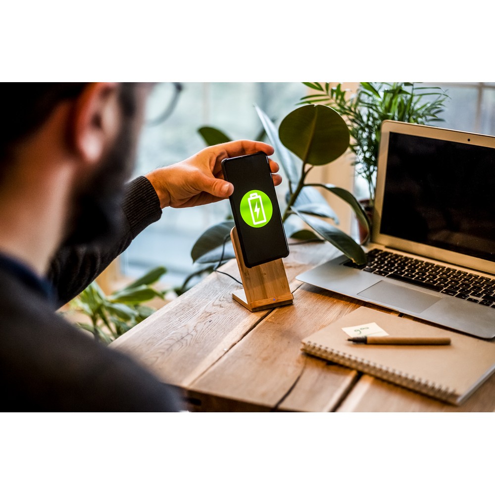 Der Telefonständer „Evolva“ ist die perfekte Kombination aus Funktionalität und Ästhetik. Hergestellt aus hochwertigem Bambus, bietet er nicht nur einen stabilen Halt für Ihr Telefon, sondern verfügt auch über eine kabellose Ladefunktion mit 10W Leistung. Einfach Ihr Gerät mit induktiver Ladefunktion auf den Ständer legen und es wird automatisch aufgeladen. Mit einer kabellosen Ladestrecke von bis zu 8 mm ist es nicht notwendig, Ihr Telefon aus der Hülle zu nehmen. Der Telefonständer „Evolva“ wird mit einem Micro-USB-Kabel geliefert und ist kompatibel mit Geräten, die über einen Micro-USB-Anschluss verfügen. Erleben Sie die Freiheit des kabellosen Ladens mit Stil und Komfort.