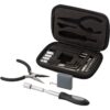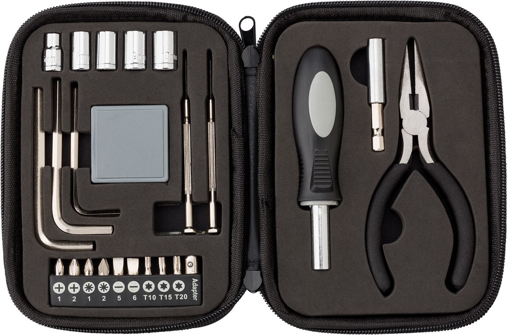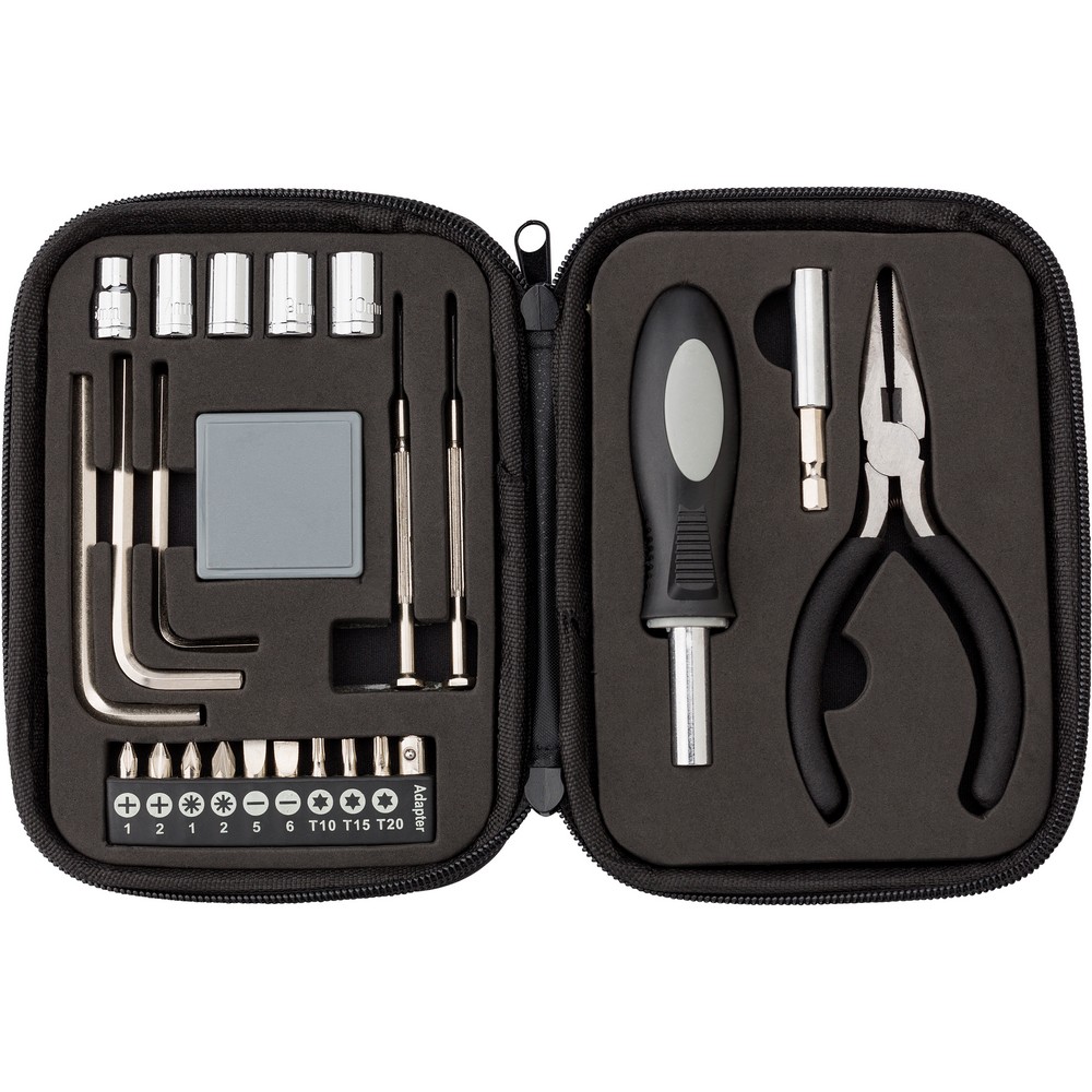 Entdecken Sie das vielseitige Werkzeugset „Uppsala“ – Ihr unverzichtbarer Begleiter für alle Heimwerkerprojekte. Dieses kompakte Set enthält 24 hochwertige Werkzeuge, darunter 5 Steckschlüssel, 3 Sechskantschraubendreher, 9 Schraubendreherbits, 1 Stecknuss, 1 Maßband, 2 Präzisionsschraubendreher, 1 Schraubendrehergriff, 1 Verlängerungsstange und 1 Zange. Alles sicher verstaut in einem eleganten, schwarzen Reißverschluss-Etui aus robusten Materialien wie ABS, EVA, Metall, Polyester, PU und TPR. Mit einer handlichen Größe von 17 x 12,5 x 3,5 cm ist es ideal für unterwegs. Perfekt für den ambitionierten Heimwerker, der Qualität und Funktionalität schätzt. Herkunftsland: China.